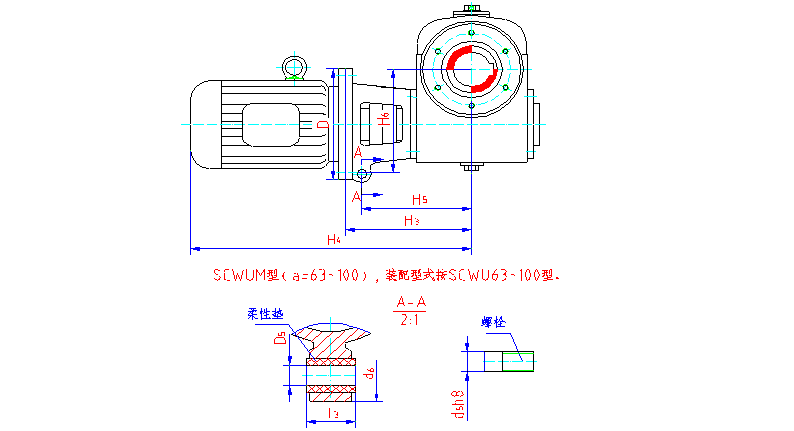 SCWUM—蜗杆在蜗轮之下的轴装式圆弧圆柱蜗杆减速器,带电机和法兰盘;